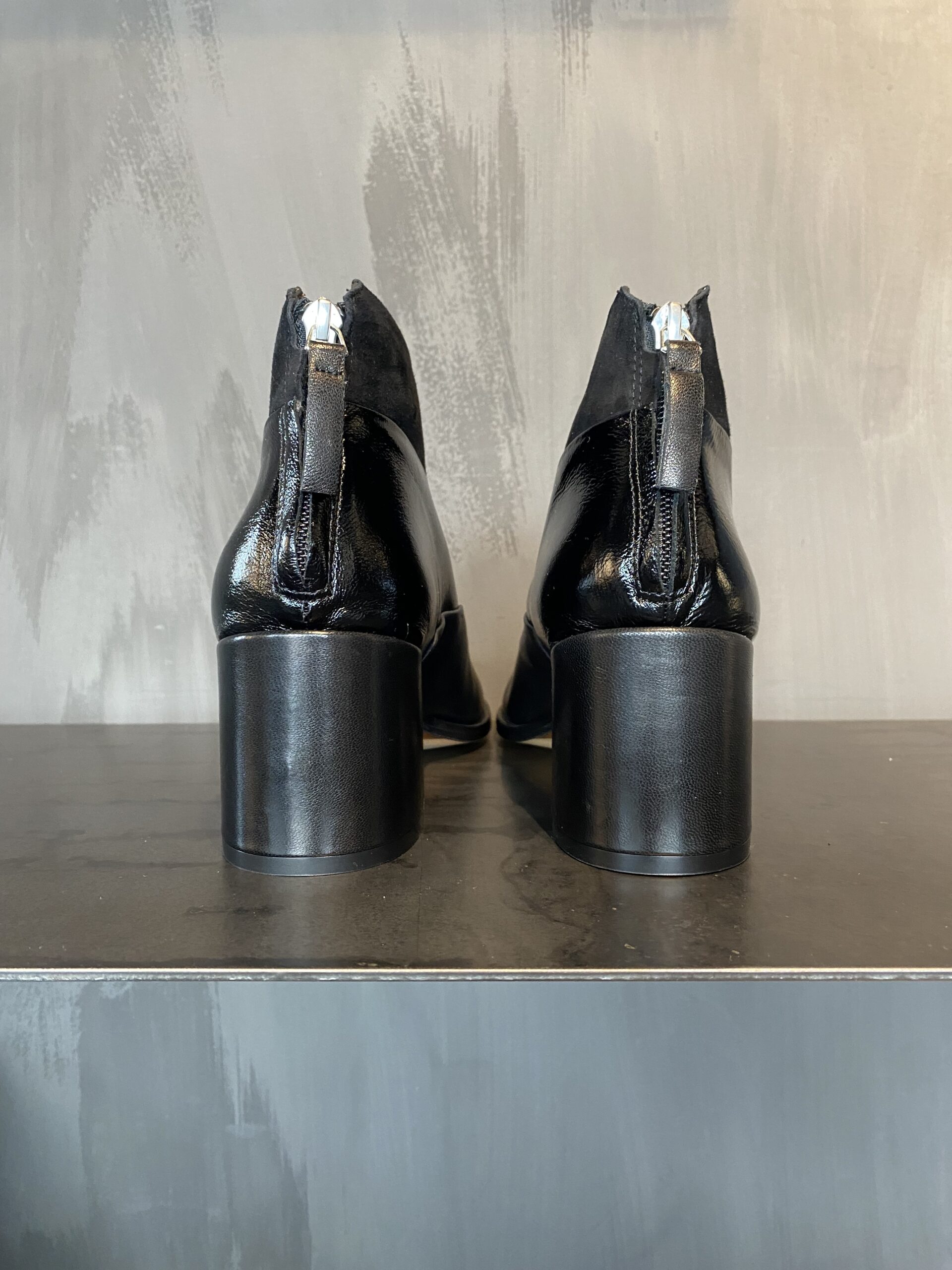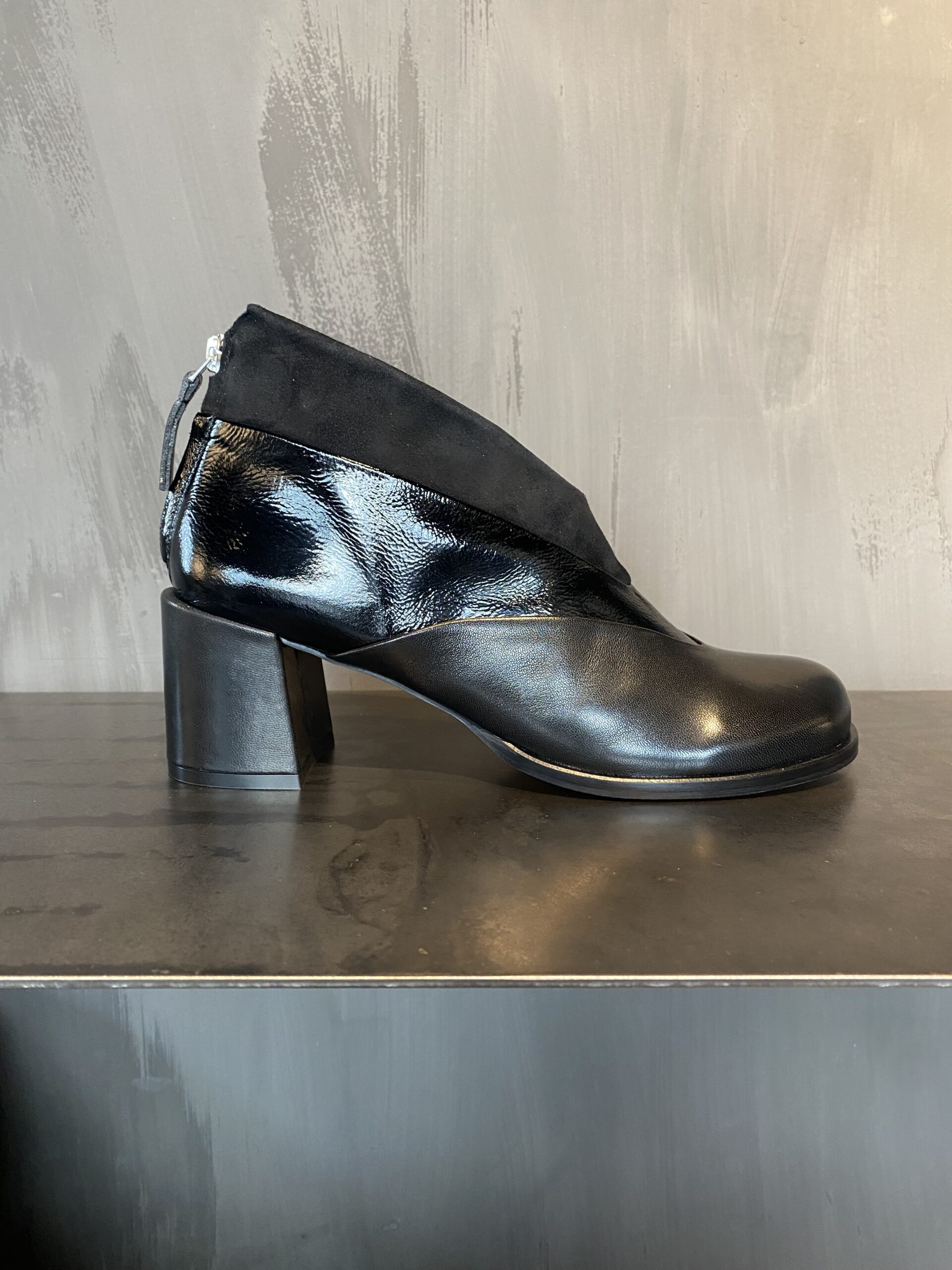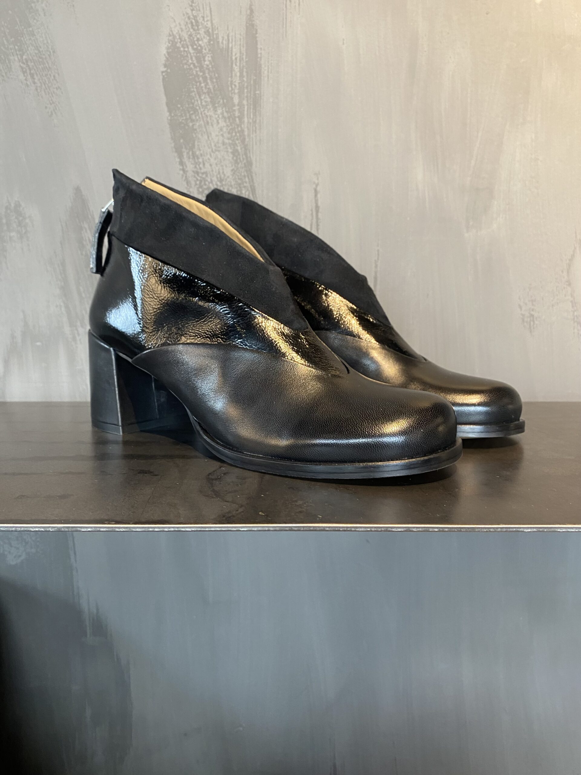 Fallegir klassískir hælaskór úr leðri og rúskinni. Sniðið er æðislegt þar sem að klaufin framan á skónum lengir og grennir fótinn, passa frábærlega bæði við buxur og sokkabuxur. Hællinn er breiður, stöðugur og passlega hár úr leðri. Dúnmjúkur gúmmísólinn er svakalega góður og er skórinn renndur að aftan. Skemmtilegt hvernig leðrið og rúskinnið blandast með mismunandi áferð.