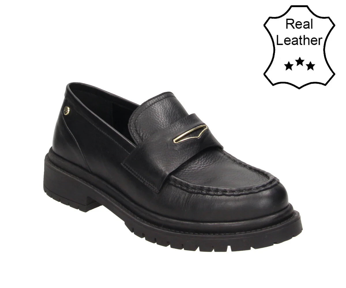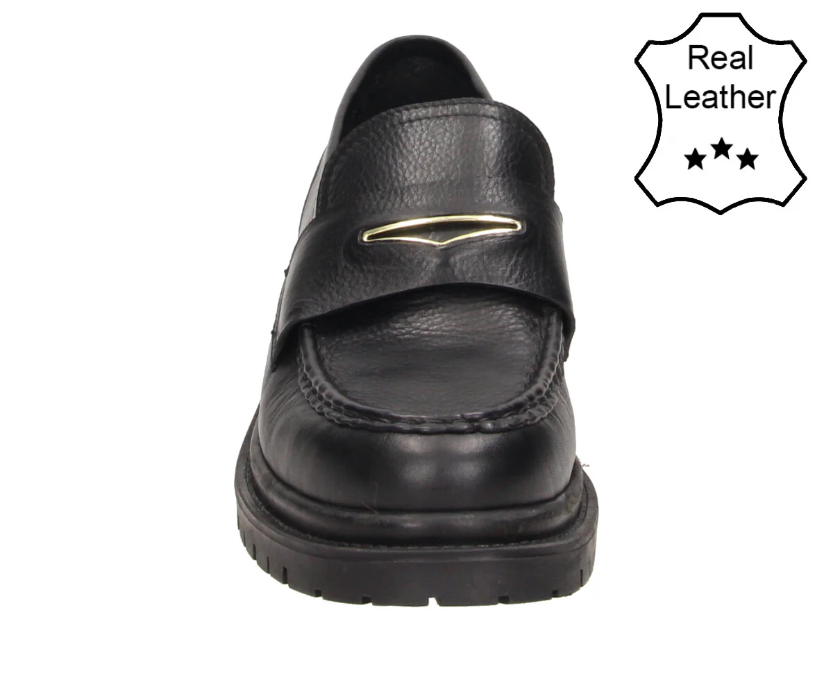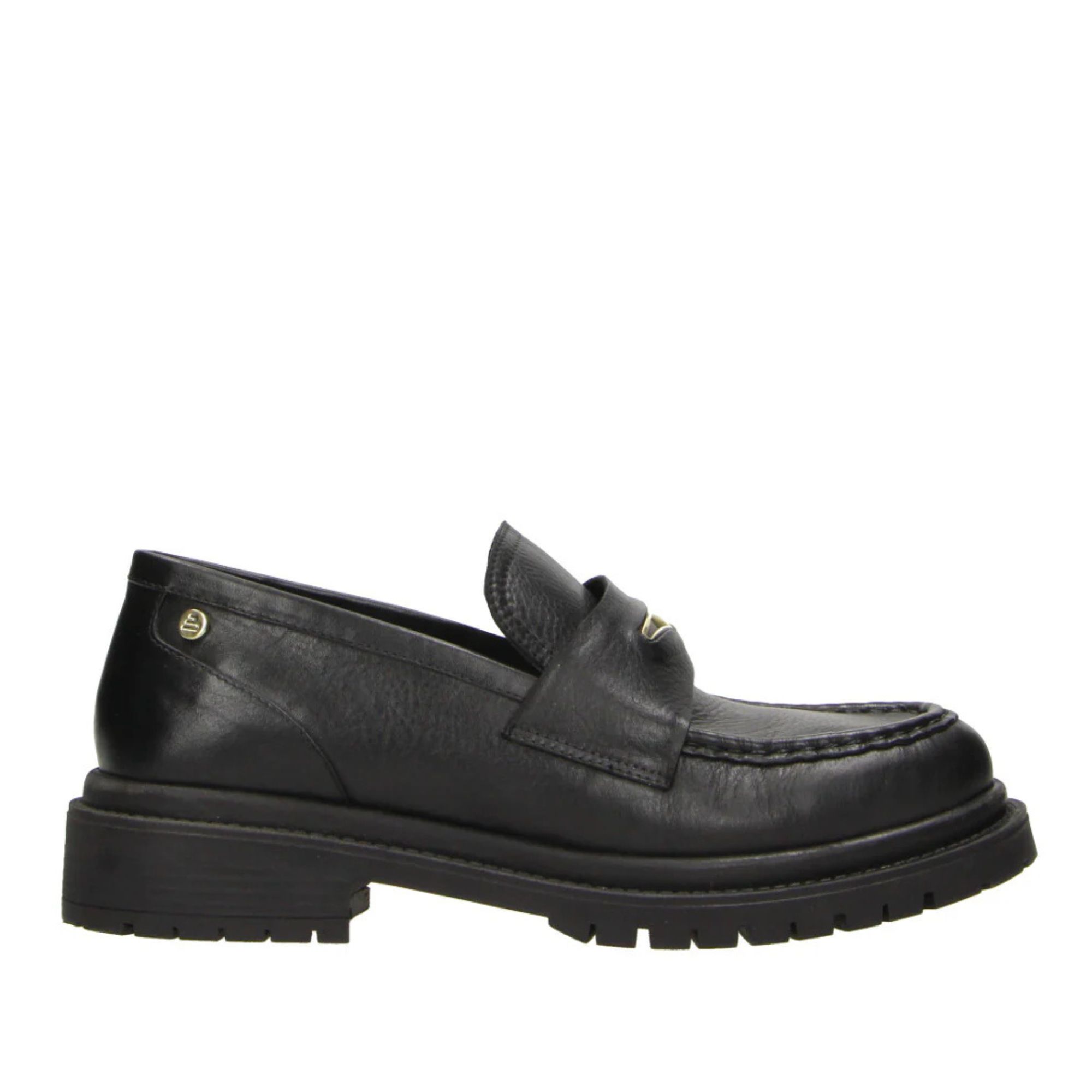 Grófar mokkasíur með 3cm sóla í svörtu leðri. Klassískt mokkasíusnið en gullið í leðurbandinum yfir ristina gerir svo mikið fyrir skóinn. Þægilegar og frábærar vetrar-mokkasíur.