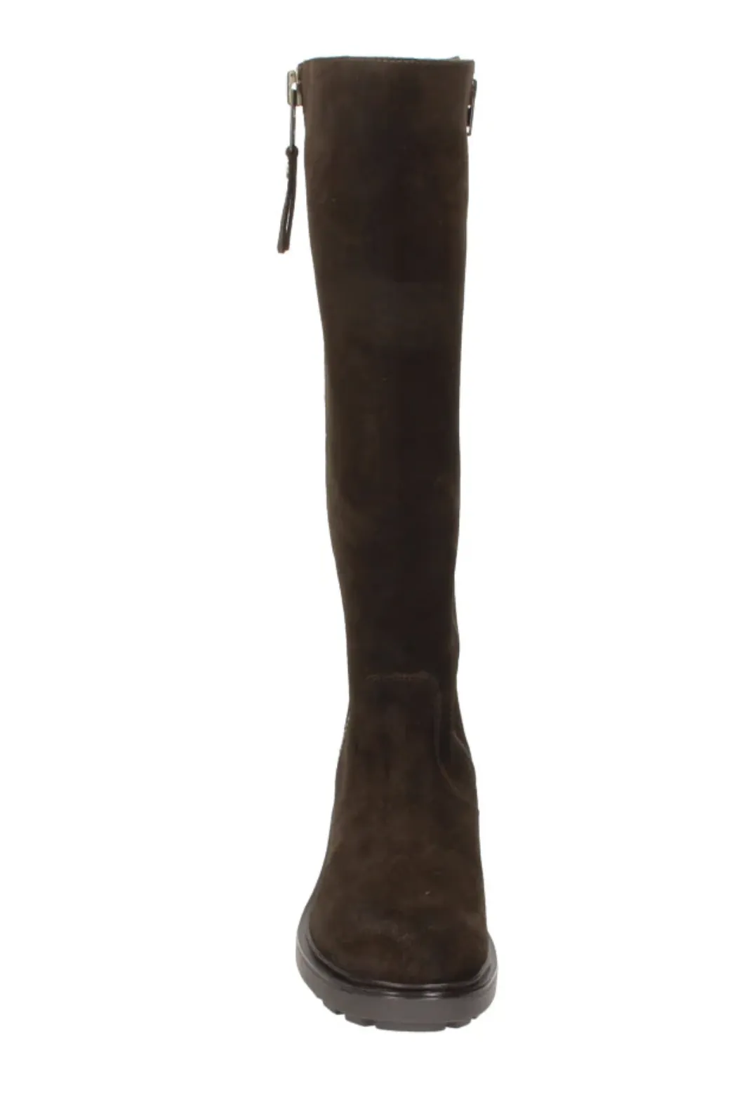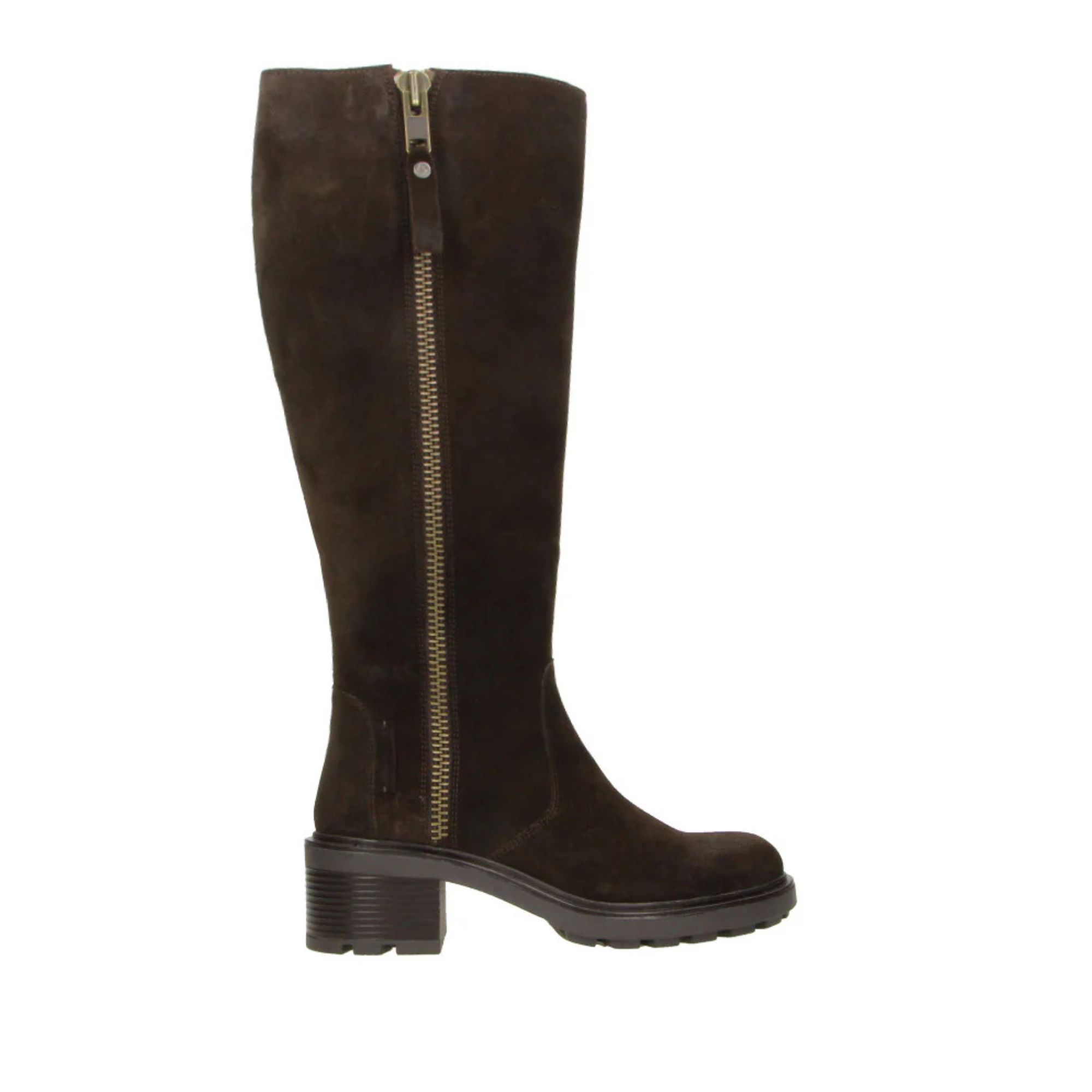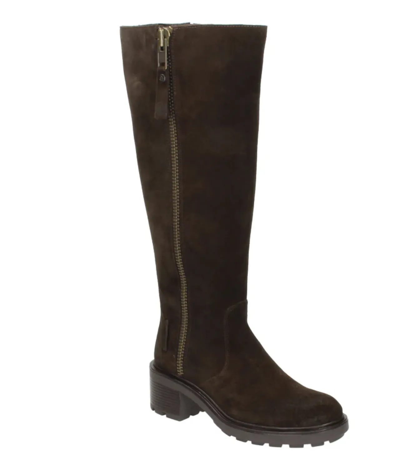 Æðisleg stígvél með þægilegum passlegum hæl og grófum gylltum rennilás að utanverðu til skrauts. Rennd að innanverðu og falleg rúnuð tá. Við elskum brún rúskinnsstígvél þessa dagana.