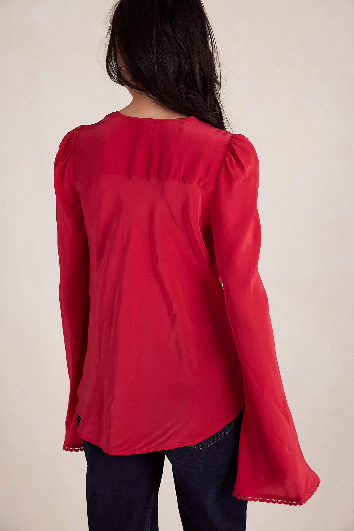 Geggjaður toppur, frekar síður og bundinn saman að framan með þremur slaufum. Smá blúnda neðst á ermunum og yfir brjóst. Við elskum þennan!