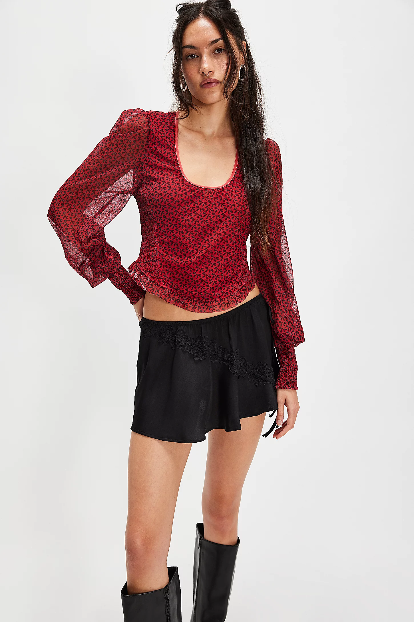 Æðislegur toppur úr léttu efni, smá munstur í efninu. Fallegar blöðruermar og efnið í þeim er þynnra og gegnsætt en í restinni af toppnum. Teygja neðst á ermum, í hliðum og á bakinu. Smá flauelsborði í hálsmálinu, svo sætur þessi.