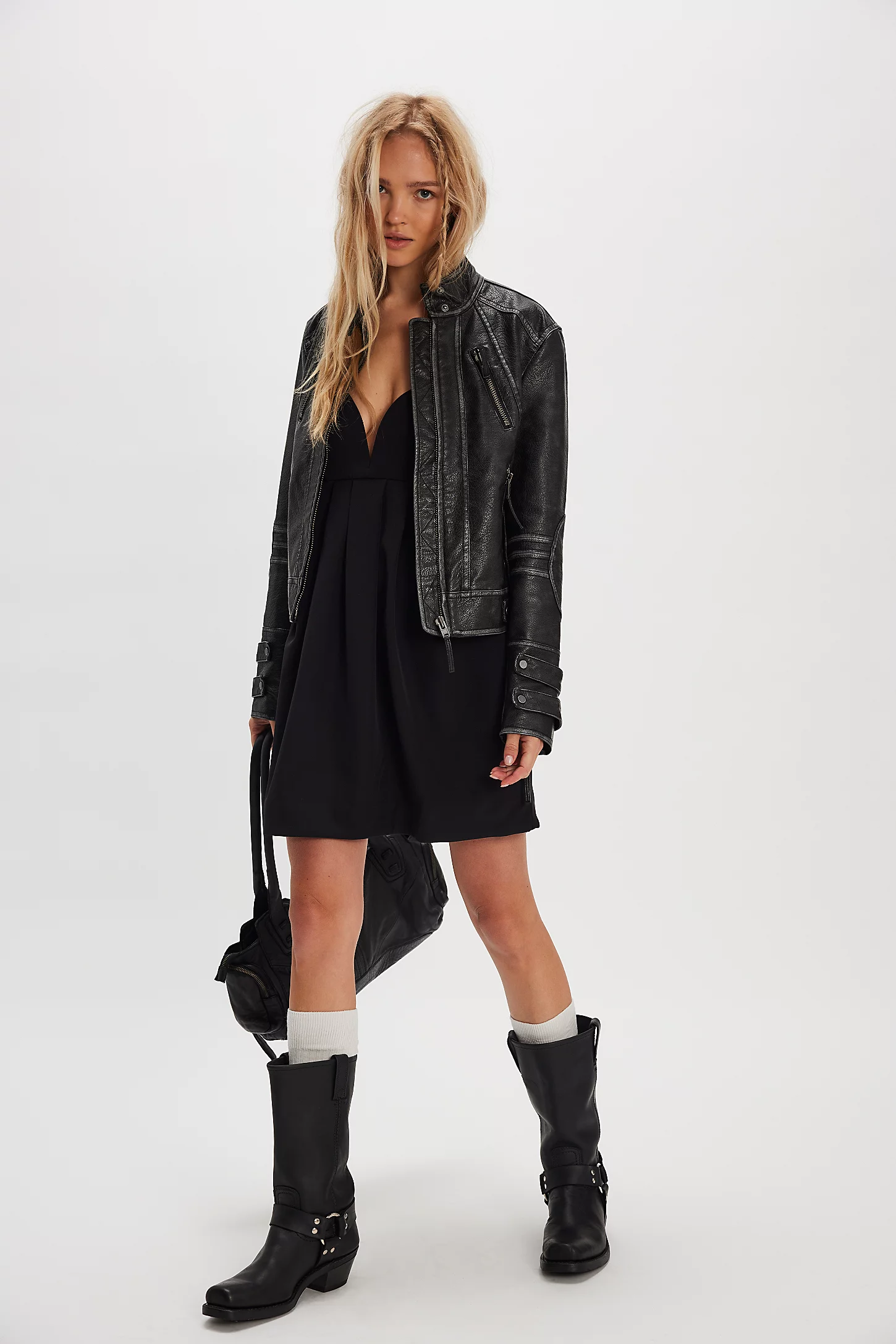Hlýralaus svartur kjóll, opinn í bakið og bundinn um mitt bak. Hjartalaga snið yfir brjóst og vír að innan til að stífa efri partinn.