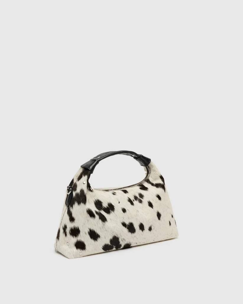 Mjög falleg taska úr ekta leðri með hárum í svokölluðu kúamustri, hvítt með svarbrúnum skellum hér og þar og engin taska er eins. Æðisleg stærð, þægileg fyrir allt það helsta, renndur vasi að innan og svo fylgir silfur keðja með og stillanleg ól. Mjög skemmtileg og öðruvísi taska.