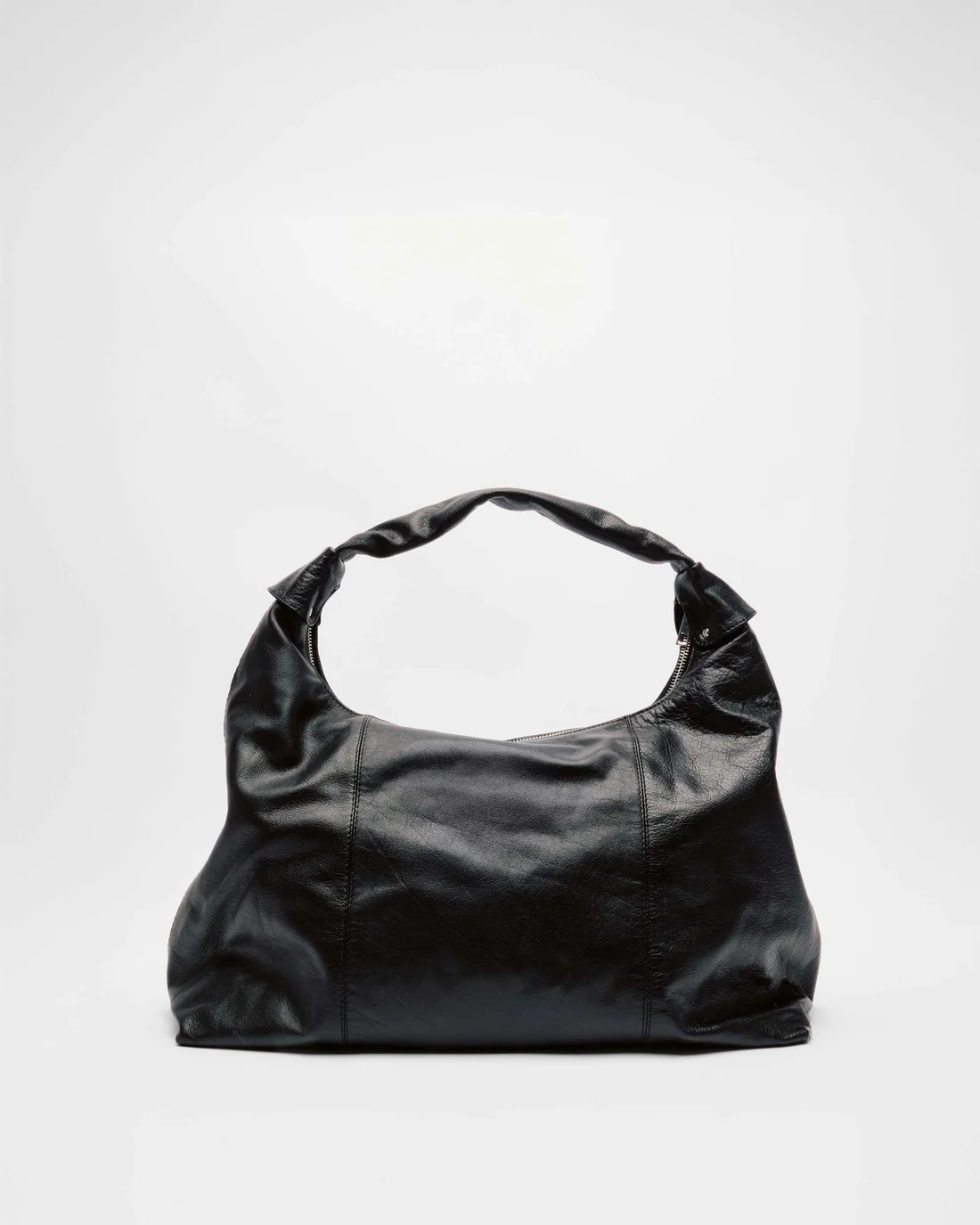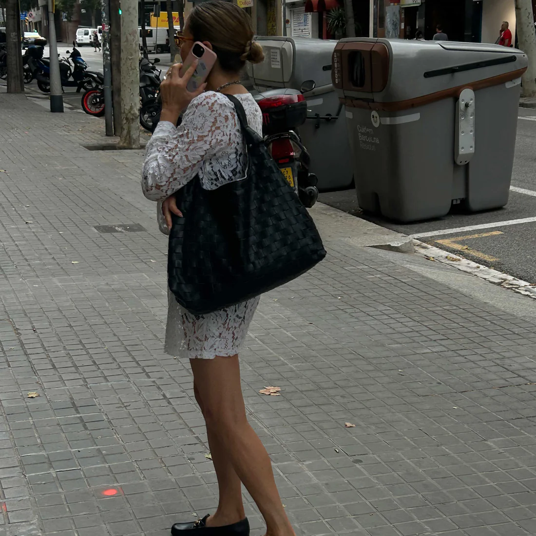 Geggjuð stór taska úr fléttuðu leðri, hún fléttuð að framan og slétt að aftan. Hún lokast með rennilás og svo eru tvö hólf inni í henni, eitt rennt og eitt ekki. Þessi taska er einstök og fullkomnar lúkkið.